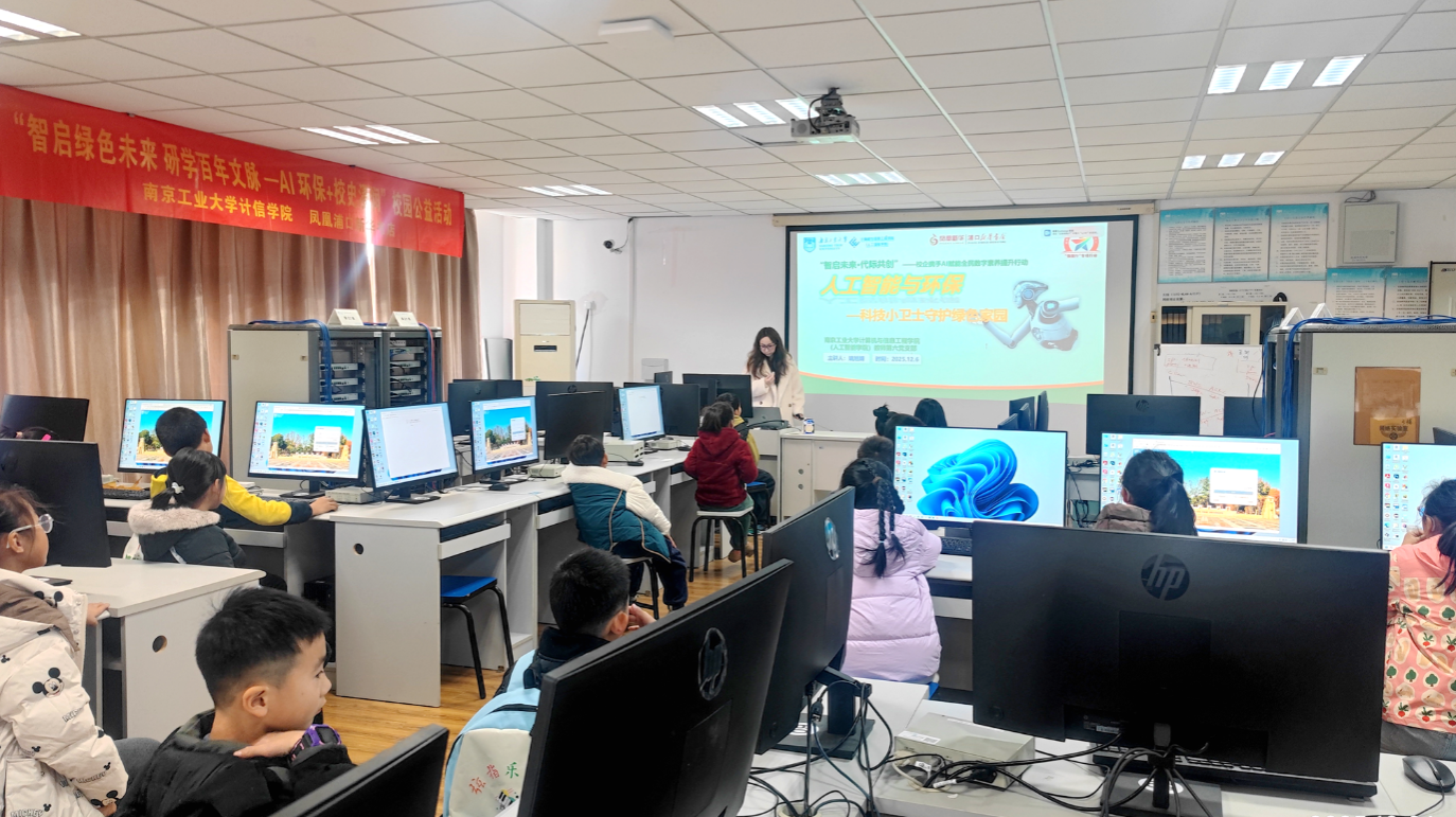 活动伊始,崇德楼A511实验室里,学院工会副主席景朋森介绍了活动背景及流程。随后,教师第六党支部姚旭婧以《疯狂动物城》生态危机为切入点,开展“人工智能与环保——守护绿色家园”公益讲座。她结合雾霾、水污染等现实问题,生动讲解AI在污染监测、垃圾处理、生态保护等领域的应用,从水质智能检测、垃圾分拣到野生动物识别,让小读者直观感受科技护绿力量,激发环保热情。