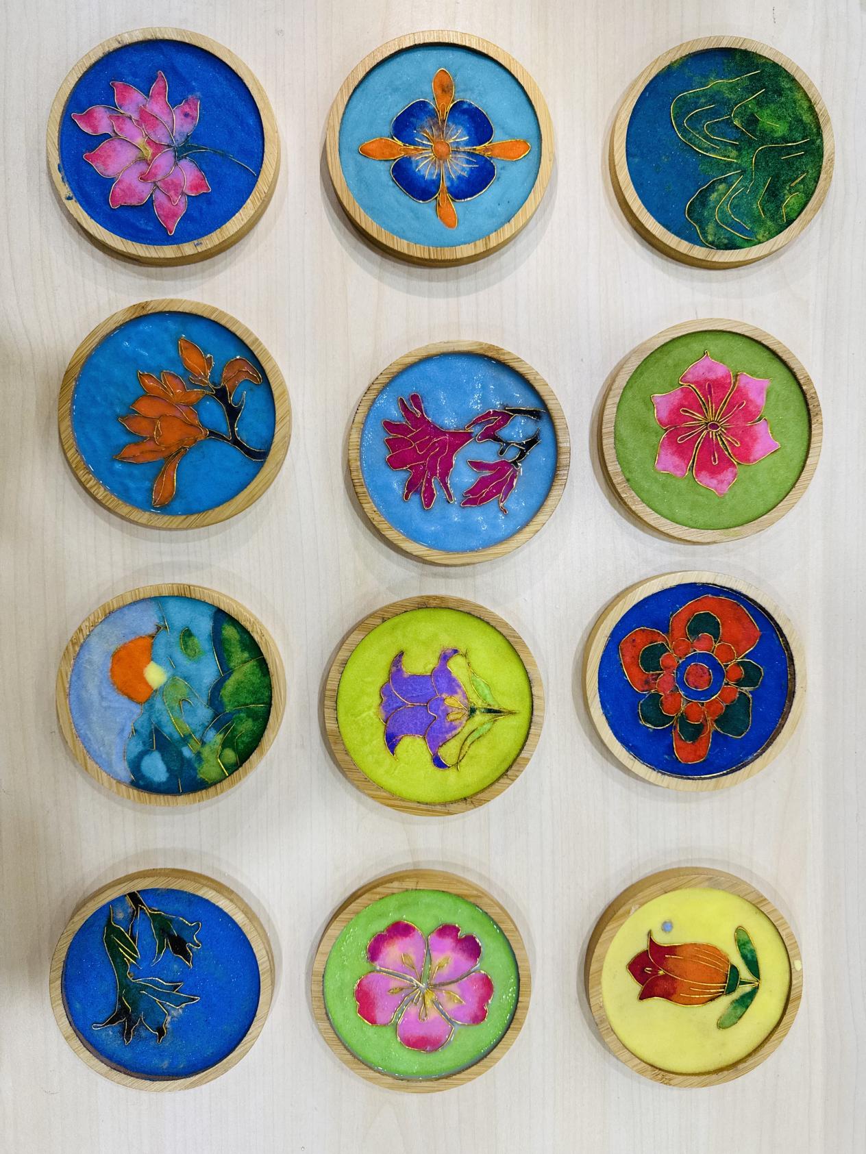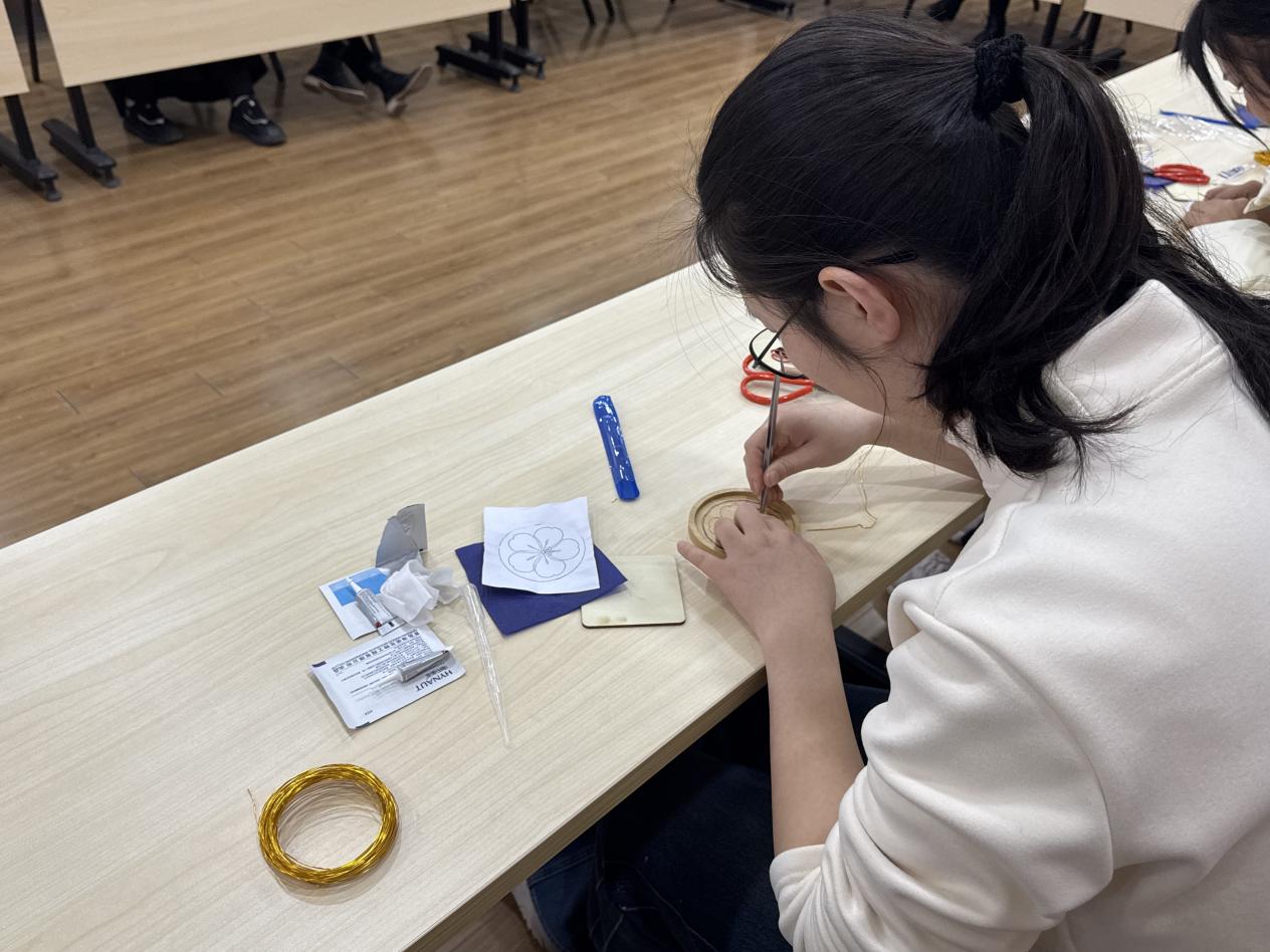 掐丝珐琅制作体验中,大家凝神静气、细品非遗之韵。在手工老师的悉心指导下,描图、掐丝、粘丝、点蓝,步步考究、匠心倾注。纤细金丝在指尖婉转成型,斑斓釉色于方寸间铺陈,一件件精巧作品尽显匠心与巧思。